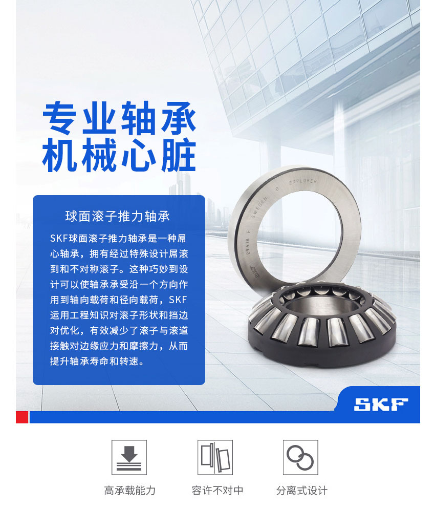 推力滾子軸承是用于承受軸向載荷為主的軸、徑向聯(lián)合載荷,但徑向載荷不得超過軸向載荷的 55% 。與其他推力滾子軸承相比,此種軸承摩擦因數(shù)較低,轉(zhuǎn)速較高,并具有調(diào)心性能。
